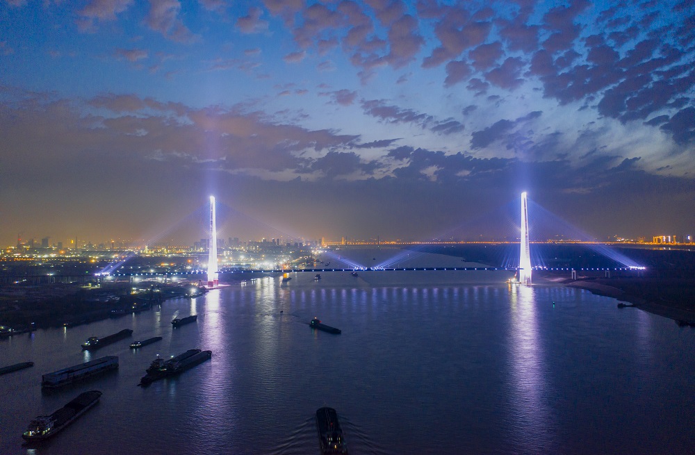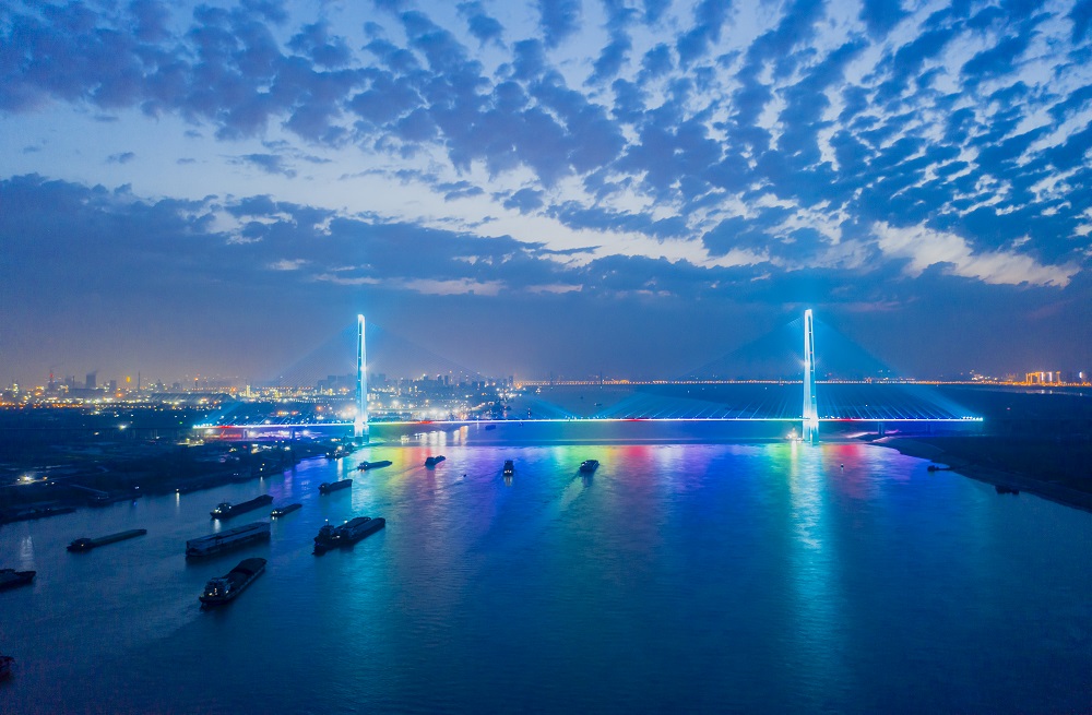 青山大橋以藍色為(wèi)主基調,寓意藍天白(bái)雲、青山綠水(shuǐ),也與長(cháng)江主軸下(xià)遊橋梁的“冷色系”契合。青山大橋選用全漂浮體系斜拉橋設計方案,其中主塔在大跨徑斜拉橋中首次采用無下(xià)橫梁的特殊設計,使得整座橋看(kàn)起來高(gāo)聳纖長(cháng)、大氣美觀。大橋整體采用藍白(bái)搭配的主色系,以保證駕駛員(yuán)通(tōng)過大橋時不産生(shēng)視覺疲勞;大橋邊側防撞護欄裝有浪花造型的裝飾闆,為(wèi)鋼筋鐵骨添了幾分靈動;外側欄杆上(shàng)融入黃鶴樓等造型,與江城(chéng)武漢各地标建築遙相(xiàng)呼應;橋面中間的隔離欄上(shàng)防眩闆采用綠色竹節造型,從(cóng)細節上(shàng)融入“綠色江城(chéng)”的理念